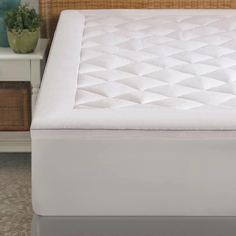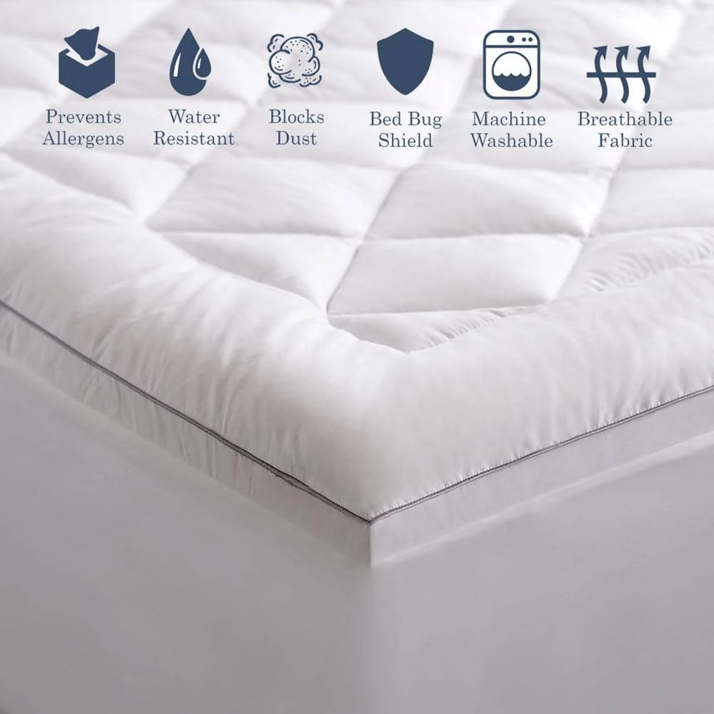 Comfort and protection combine in the Allergen Barrier Mattress Pad featuring tightly woven microfiber allergy-proof and water-resistant material. This hypoallergenic mattress pad blocks allergens such as bed bugs, dust mites and other irritants. The 1 in. gusset and framed diamond quilted construction provide ideal loft and support for your back. Filled with down-alternative fiber that mimics the support and loftiness of down. Detailed with satin cord edge and stretch skirt that fits up to a 20 in. mattress.