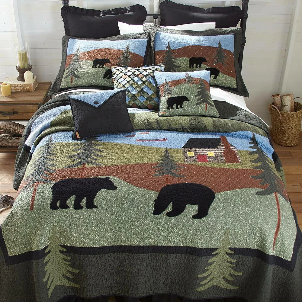 Donna Sharp’s wonderful quilt pattern, Bear Lake, has shades of green, blue and brown. The center panel is printed and shows a typical mountain scene with two bears wandering past a cozy cabin on a quiet lake. The bears, trees, cabin and canoes are printed and the entire quilt has an intricate stippling quilted pattern. Coordinating Donna Sharp throw pillows are sold separately.