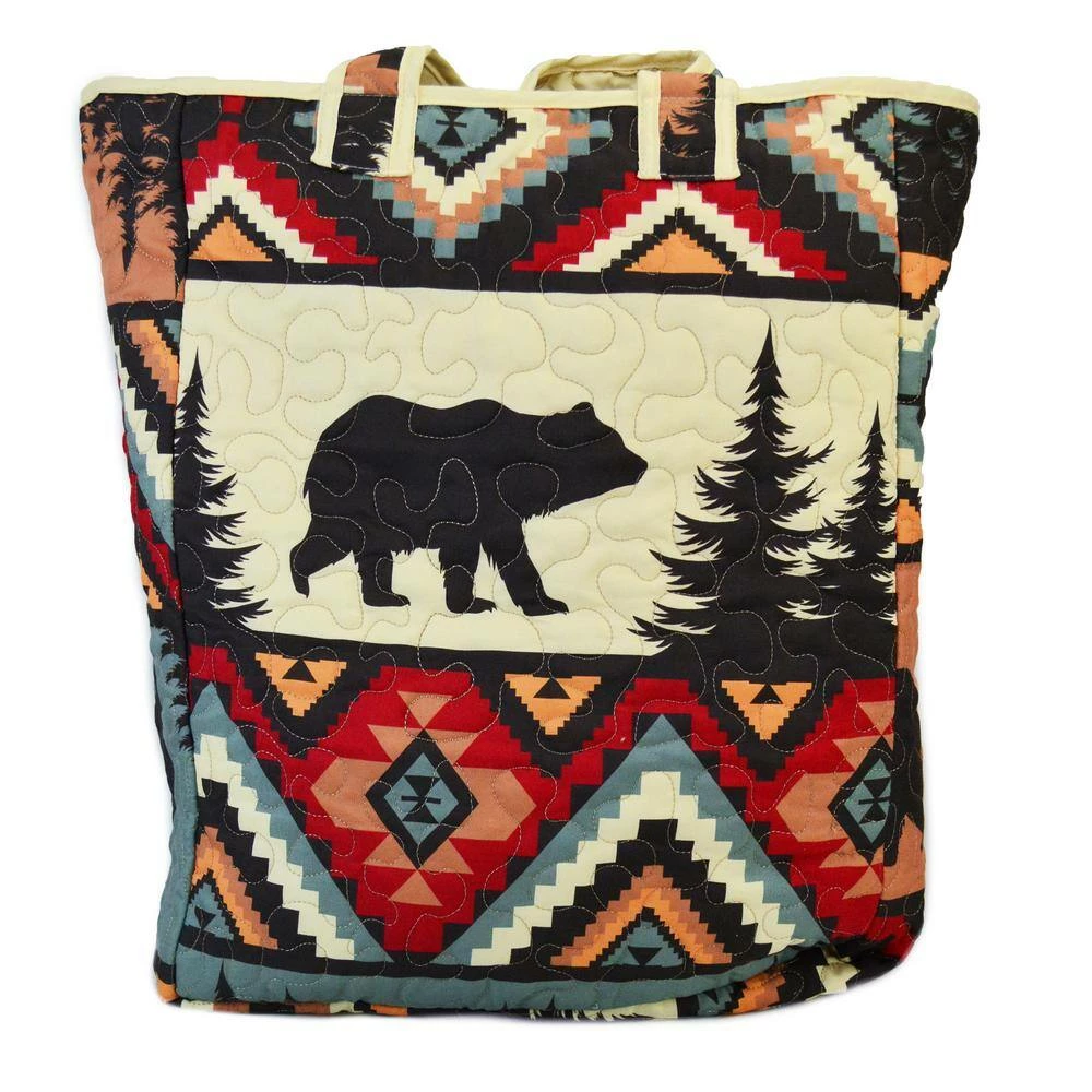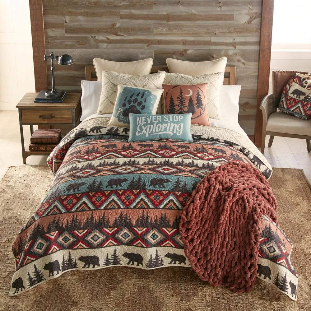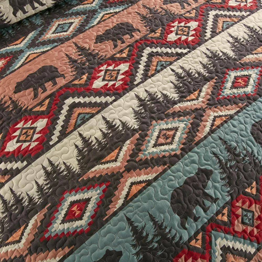 This Your Lifestyle by Donna Sharp microfiber quilt set features a Northwest pattern arranged in horizontal stripes. Bears and pine tree silhouettes alternate throughout. Colors include teal, mahogany, ivory, gold, orange and deep red. The reversible lining is an arrow pattern on ivory. The set includes a quilt and 2 shams (Twin has 1 sham) and comes in a free matching tote bag. Image may vary on sham. All accessories sold separately.