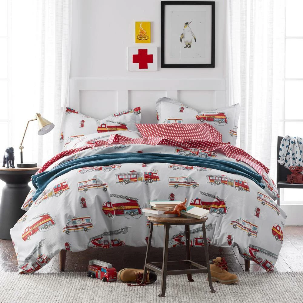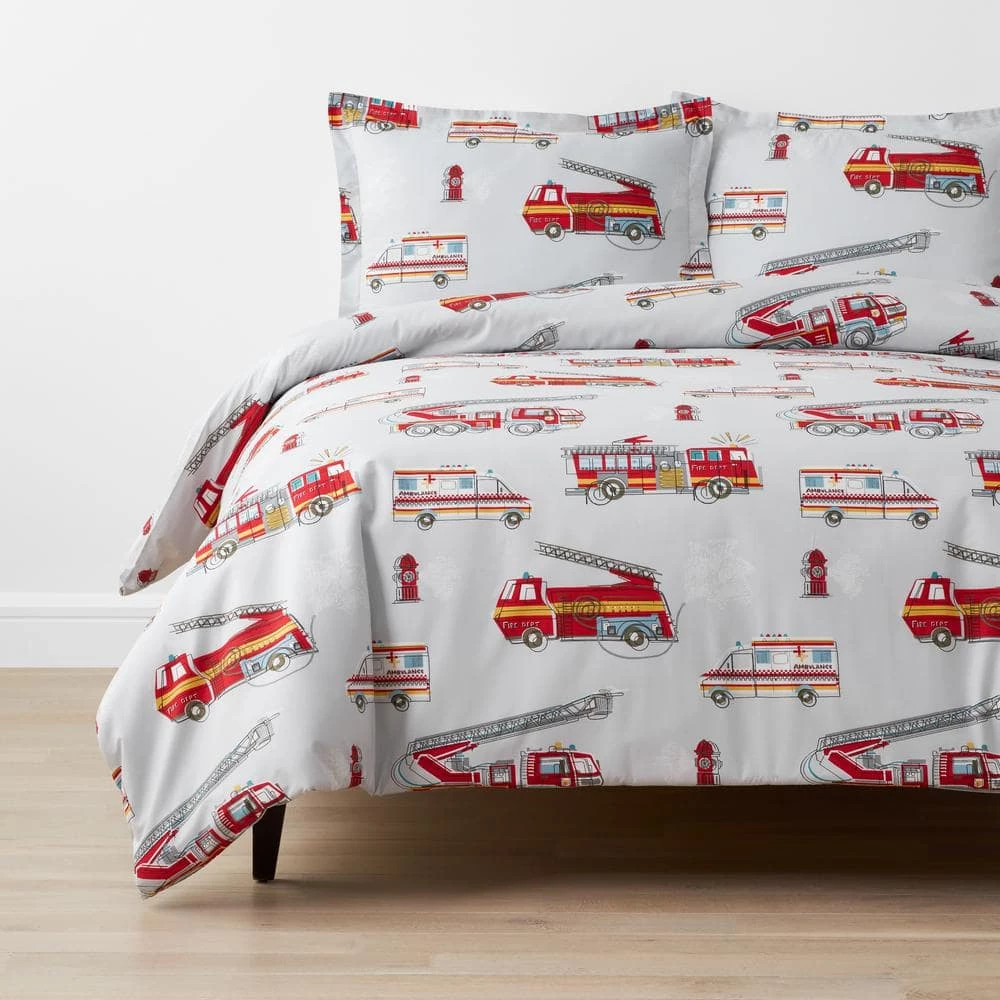 - Firetrucks and fire hydrants are printed on our organic cotton percale kids duvet cover set