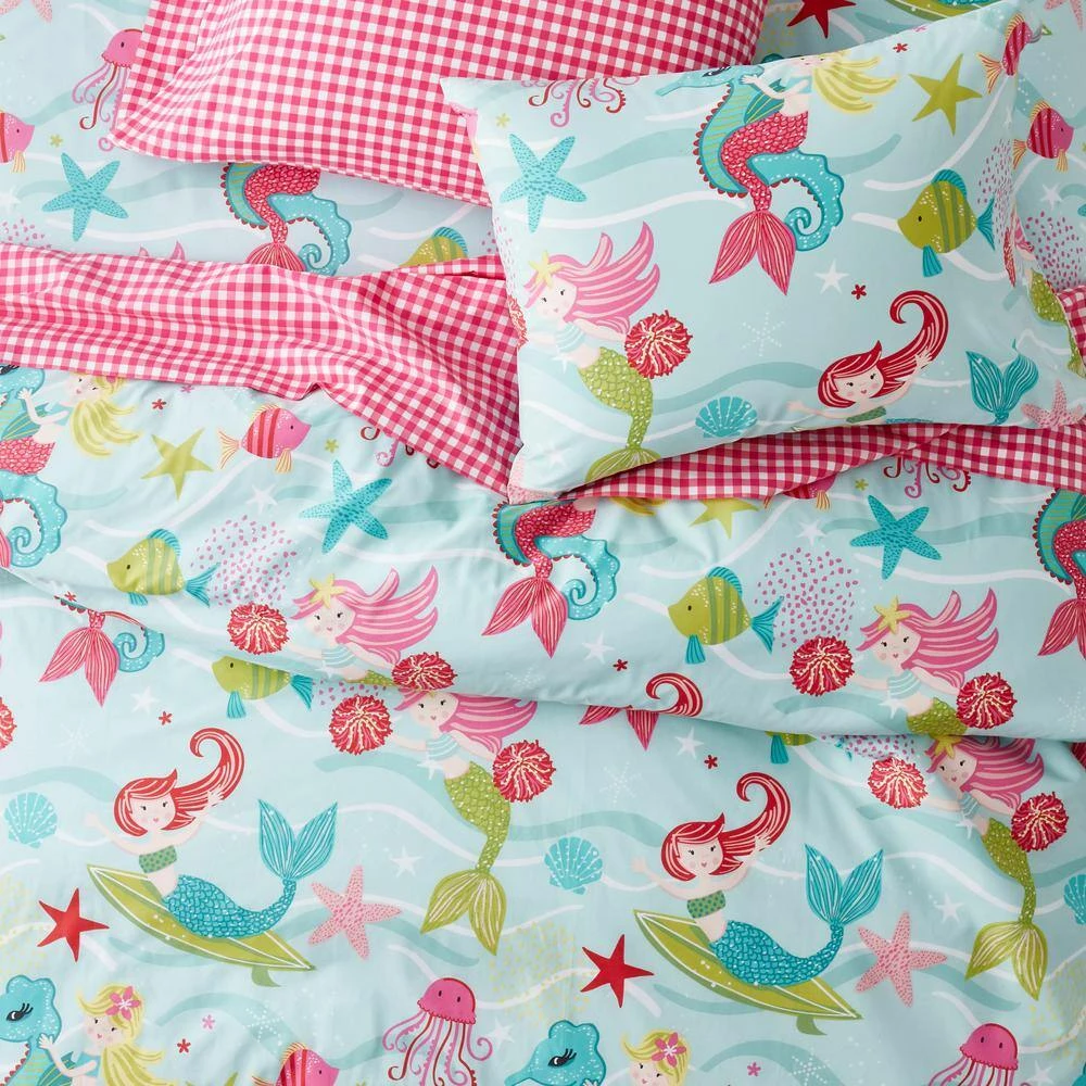 - Mermaids dance with starfish and seahorses under the sea on this organic cotton percale duvet cover set