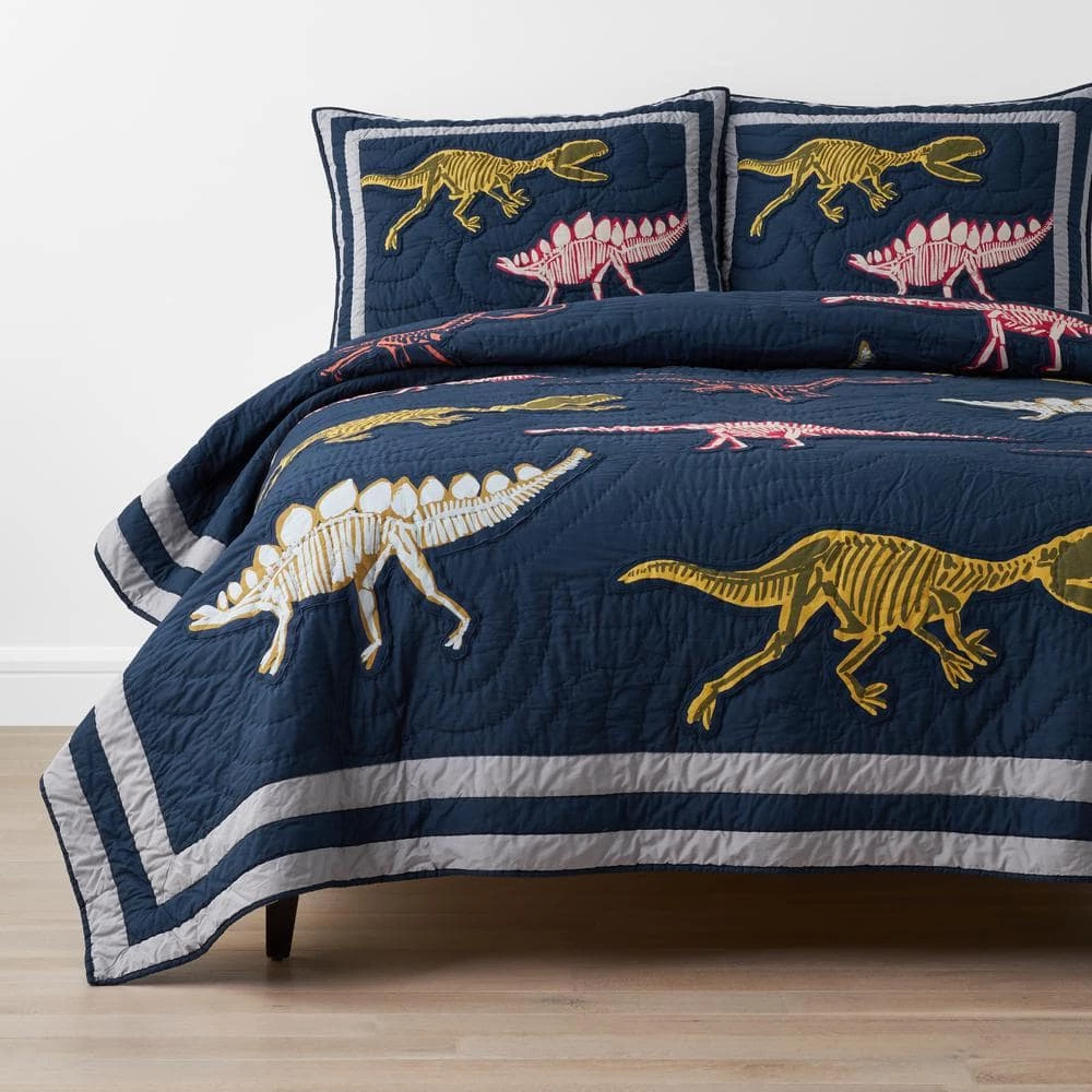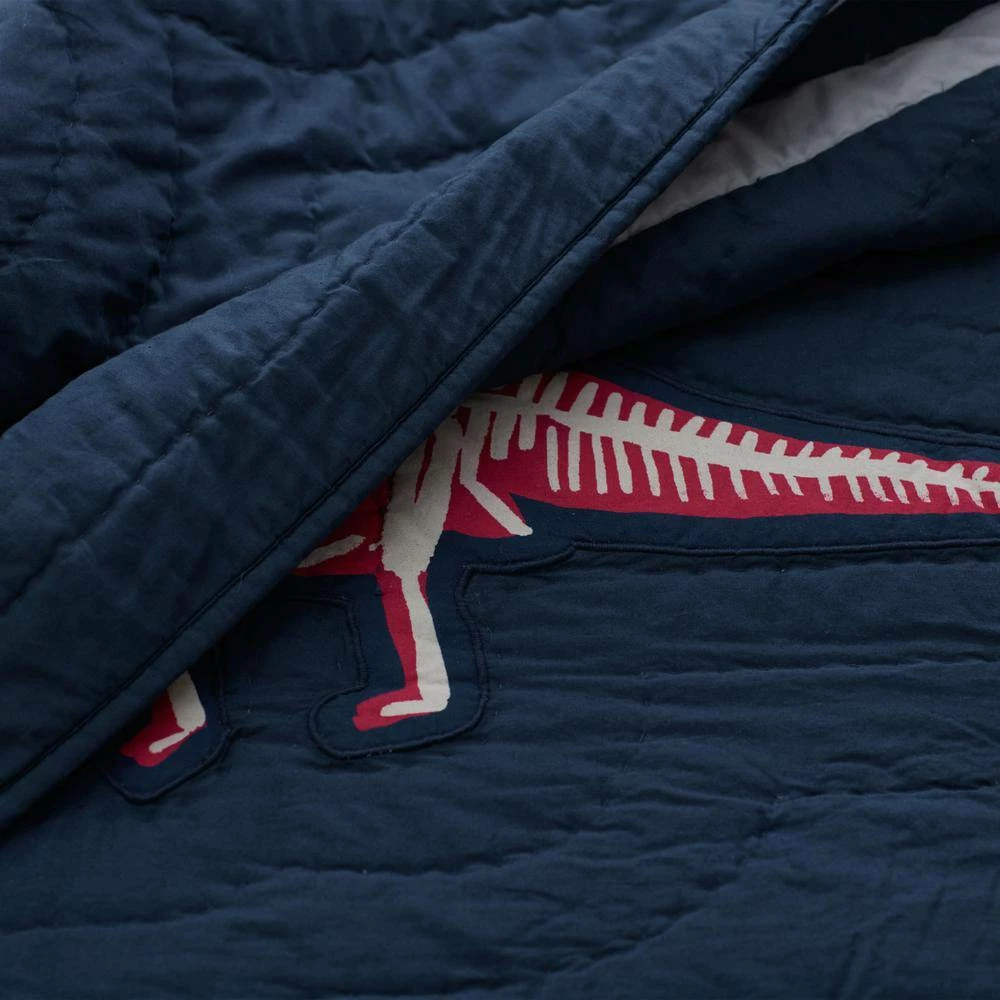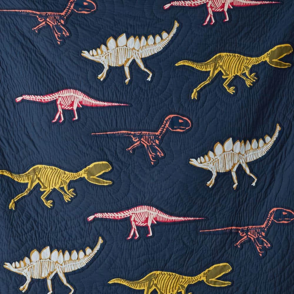 Millions of years ago dinosaurs roamed the earth, but nowadays, they’re taking up residence on our whimsical kid’s Skeleton Dino Handcrafted Cotton Quilt. Appliqued onto navy blue cotton, these fierce (but friendly) fossilized reptiles are traced with embroidery for great texture. Exclusively by The Company Store.