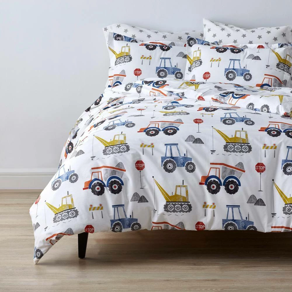 - Get ready to build, these colorful construction trucks and street signs are hard at work across our smooth cotton percale kids’ sham