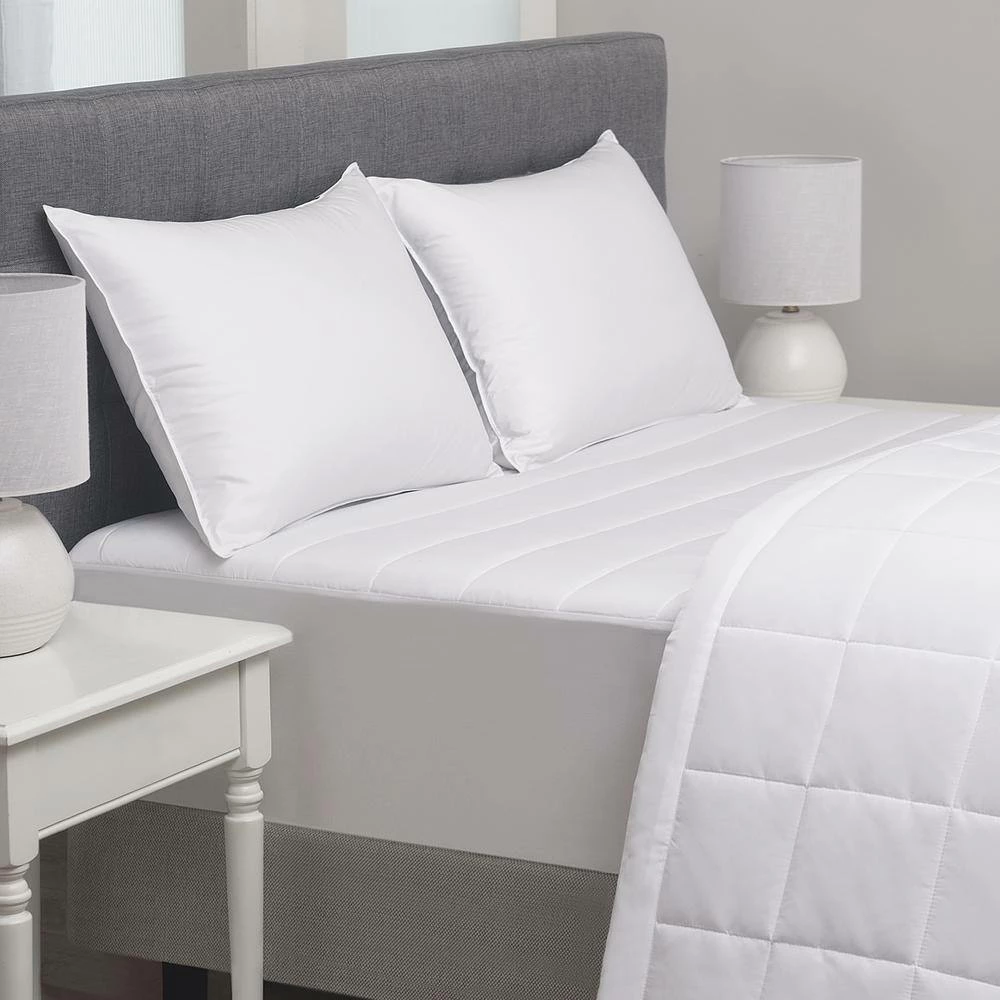 Add a layer of luxury and comfort with our 210 Thread Count Microfiber Hotel Mattress Pad. This fluffy, cloud-like pad is filled with a down-alternative fiber providing maximum resort-like sleep. A healthier night’s sleep and extra protection for your mattress awaits! Featuring a knit skirt that stretches to fit a mattress up to 15 inches deep and stay firmly in place. Hypoallergenic and machine washable for easy care.