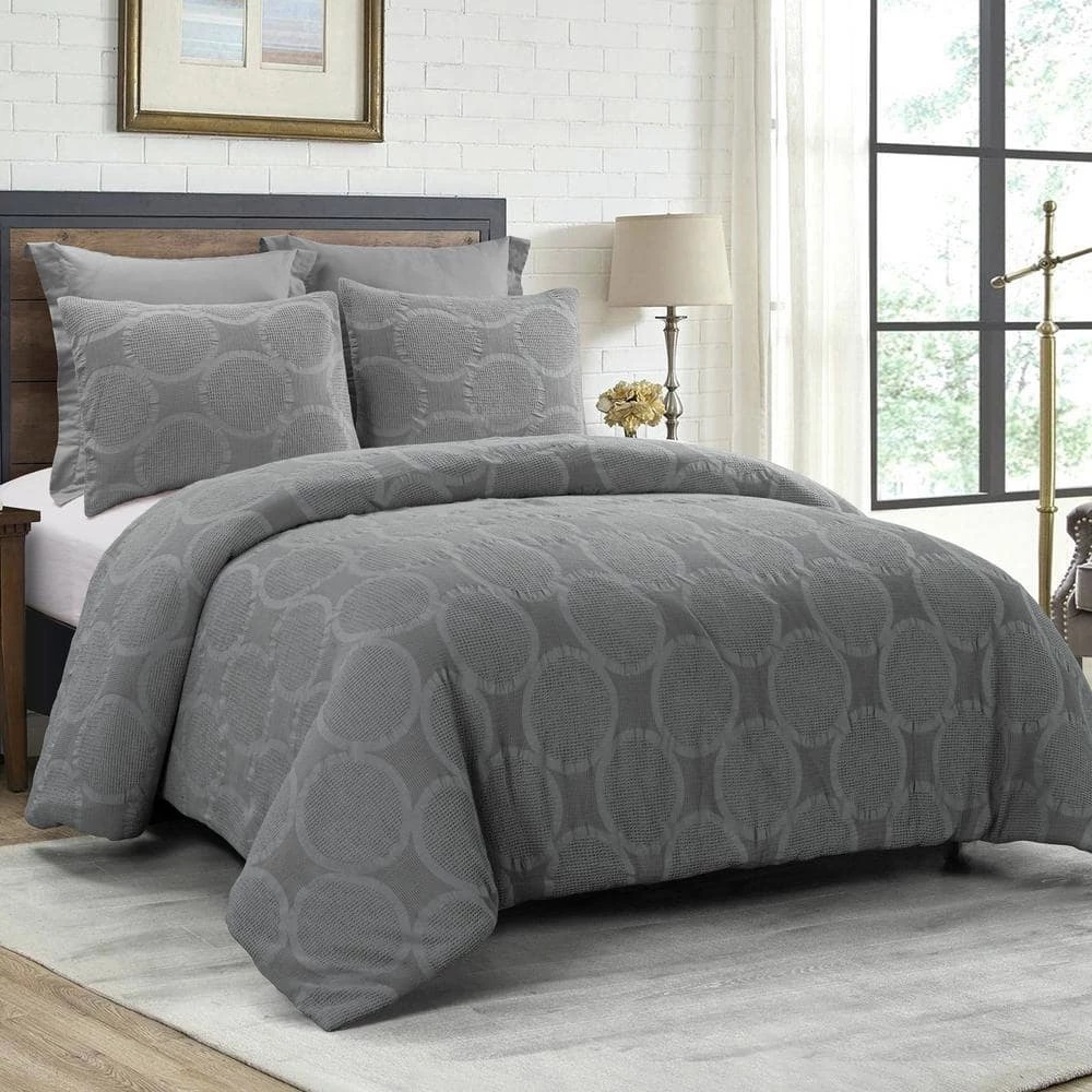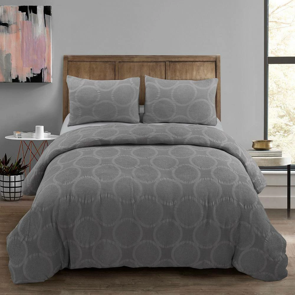 This elegantly designed Leon 3-piece cotton comforter set from DONNA SHARP is a luxurious addition to any master bedroom or guest room. The ultra-soft 100% cotton jacquard fabric is garment washed to provide a wonderfully soft touch. This bedding set is designed using a waffle weave fabric with a modern geometric pattern. A hidden pin tuck secures the batting in place without interrupting the pattern, creating a smooth, seamless appearance. Shams are included and perfectly match the comforter to complete the look of the bed. Add your own personal touch by pairing Leon with 1-of our throws or decorative pillows (sold separately). This 3-piece set comes with 1-comforter and 2-shams and is packaged in an eco-friendly linen bag.
