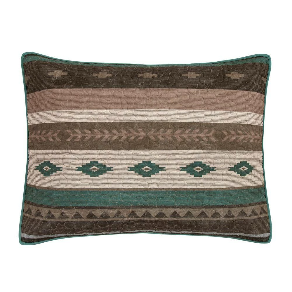 This handsome 3-piece quilted microfiber bedding collection features bands of softly-textured southwestern motifs in shades of antique ivory, black, chestnut brown, dusty teal and warm taupe. This quilt set has a soft hand right out of the package and is just the right thickness to keep you warm or cool, depending on the season. The vivid colors are great for a master bedroom or guestroom. Our coordinating decorative pillows help to carry the theme throughout your room and are sold separately.