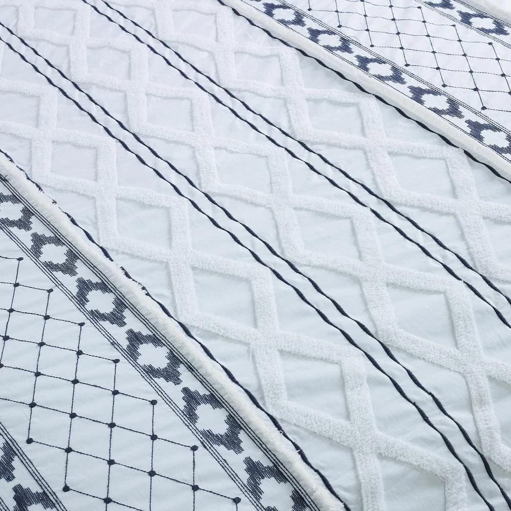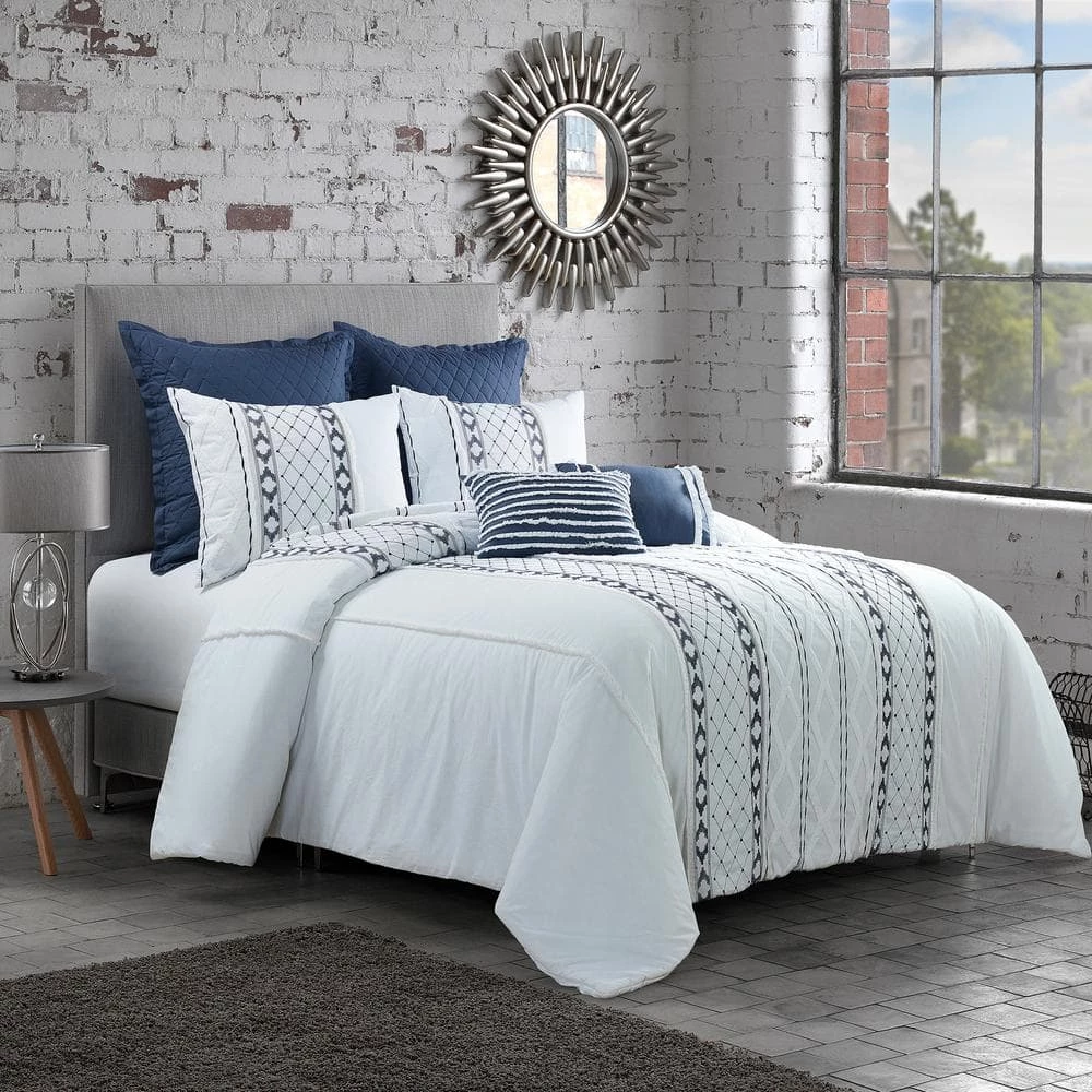 This luxurious 3-piece comforter ensemble is highly adorned with embroidered and textured accents. Deep indigo embroidery is complemented by white, soft, frayed embroidery, fringe and pleats. Made from 180 thread count cotton. Each set includes 1-comforter and 2-shams. Euro shams and decor pillows sold separately.