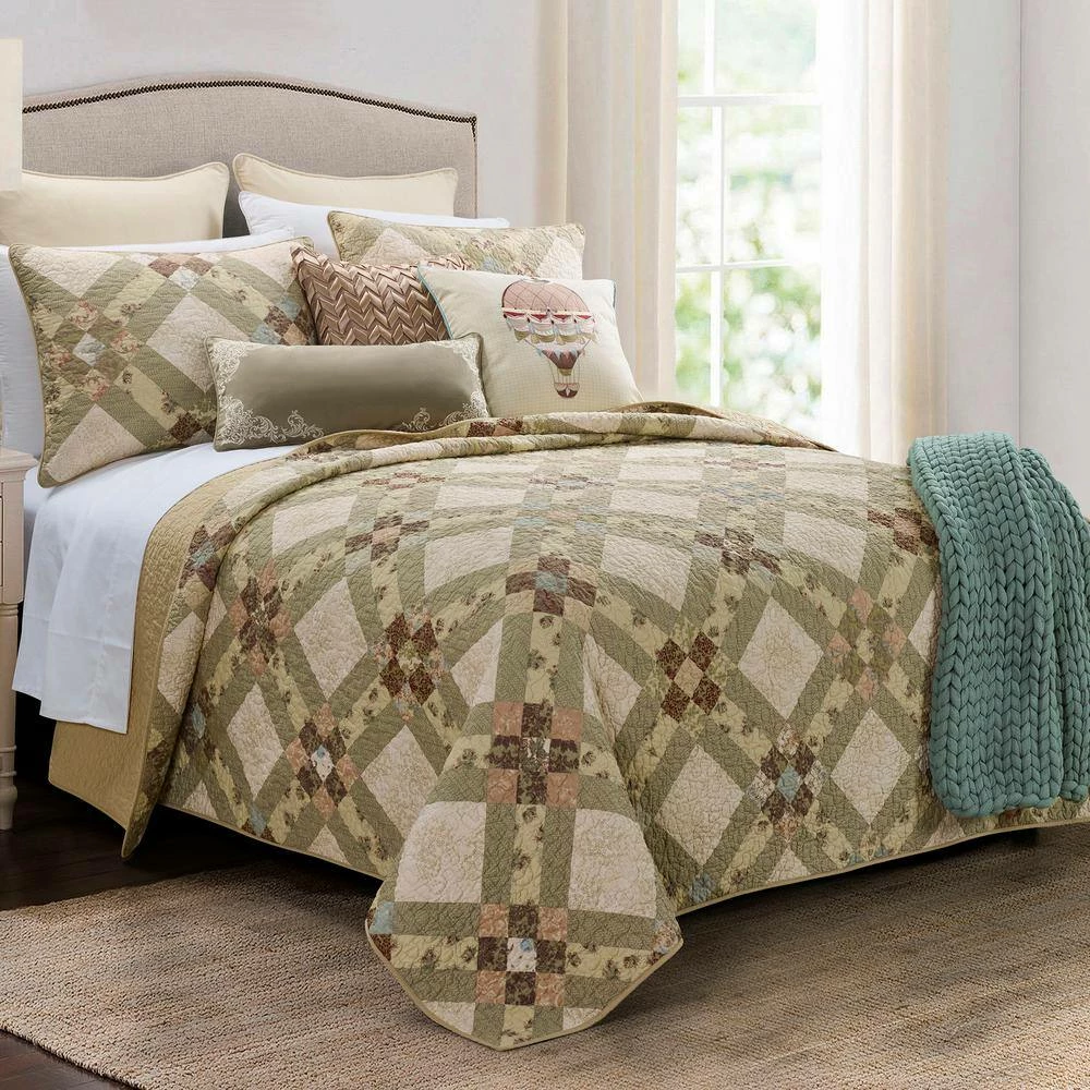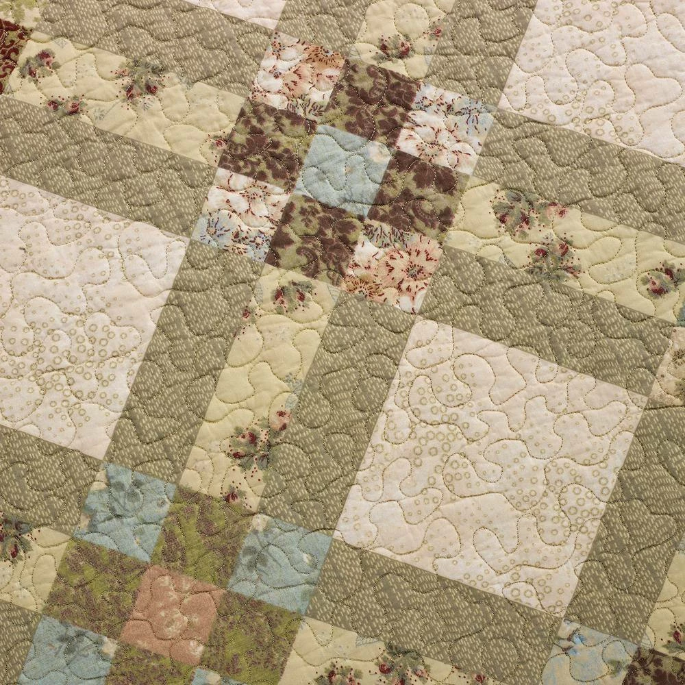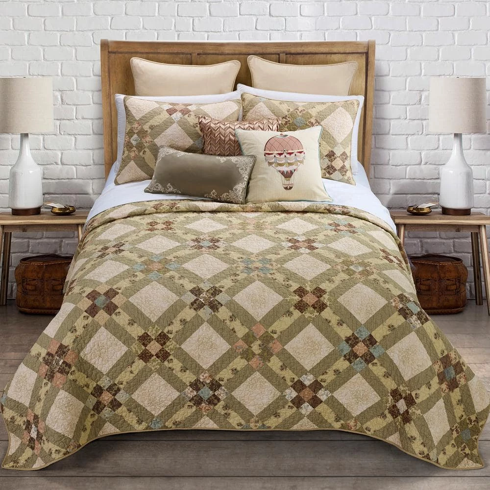 This elegant, 3-piece quilted bedding ensemble is printed on whole cloth and based on a traditional 9-patch quilt block look. Highly-detailed vintage motifs in shades of ivory, almond, sage, terracotta and gold make this an instant classic. Our coordinating accent pillows complete the collection and are sold separately. This quilt set has a soft hand right out of the package and is just the right thickness to keep you warm or cool, depending on the season. The vivid colors are great for a master bedroom or guestroom. Set includes 1 quilt and 2 shams.