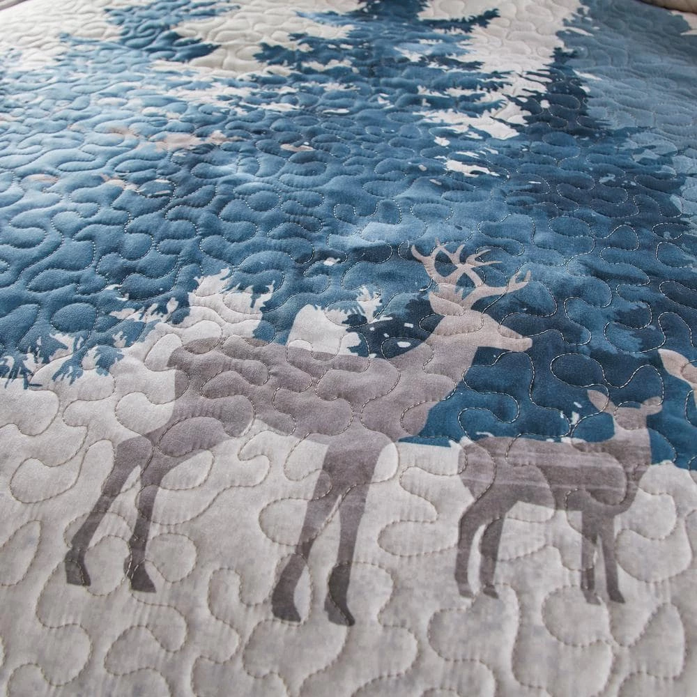This eye-catching 3-piece quilted microfiber bedding ensemble features a large watercolor scene with a deer family surrounded by a forest. Colors include peaceful tones of teal, sand, parchment and walnut. King set includes 1 quilt 110″ x 96″ and 2 King shams 20″ x 36″
