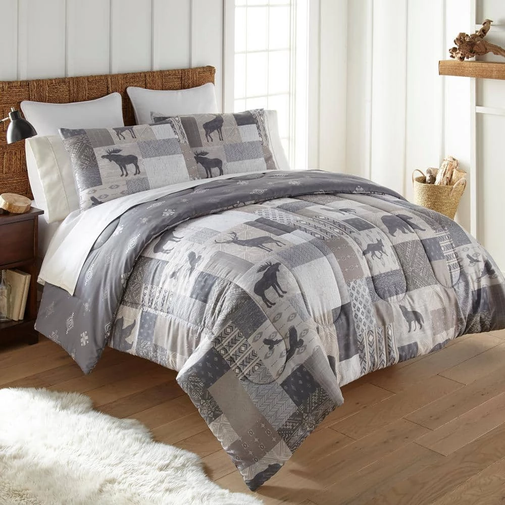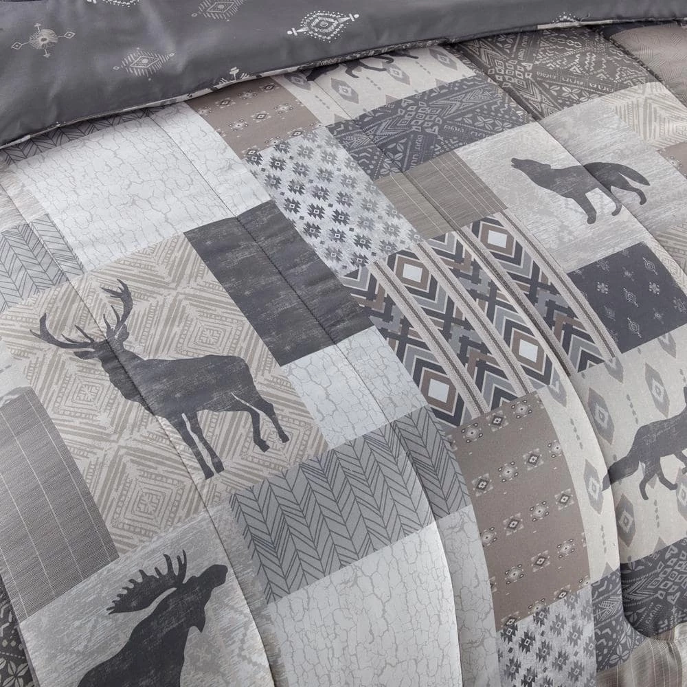 This Your Lifestyle by Donna Sharp 3pc polyester comforter set is a rustic patchwork design featuring bears, moose, deer, fox, wolves and birds. Other design elements include southwest and geometric motifs. Colors include off white, smoky grey, charcoal, ivory and taupe. The reverse side of the comforter features glyphs and symbols that complement the front of the motif. Set includes a comforter and 2 decorative pillowcases. Pillowcase image may vary. Easy care machine washable.
