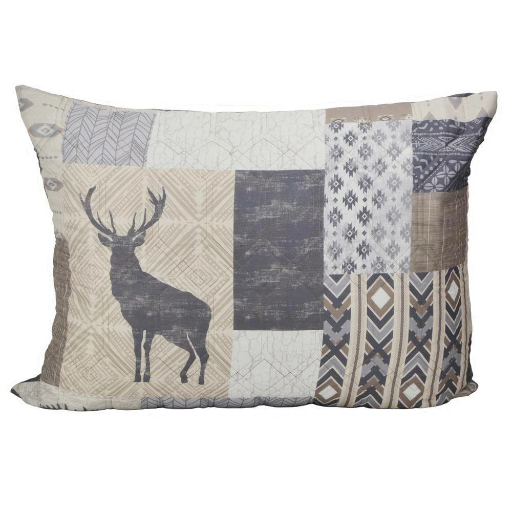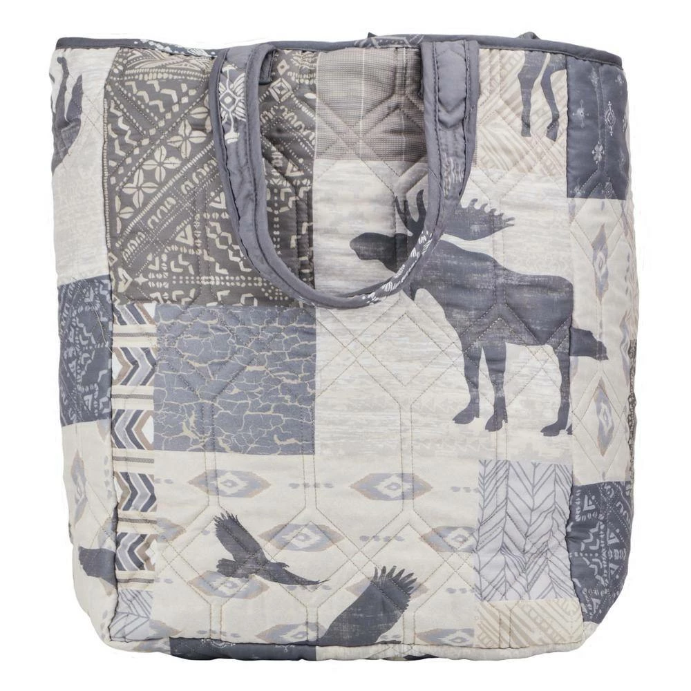 This Your Lifestyle by Donna Sharp light weight quilt set is a rustic patchwork design featuring bears, moose, deer, fox, wolf and birds. Other design elements include southwest and geometric motifs. Colors include off white, smoky grey, charcoal, ivory and taupe. The reverse side of the coverlet features glyphs and symbols that complement the motifs on the front. The set includes 1 quilt and 2 shams (Twin has 1 sham). Image on the sham may vary slightly. Easy care, machine washable fabric. Comes packaged in a Free matching tote bag.